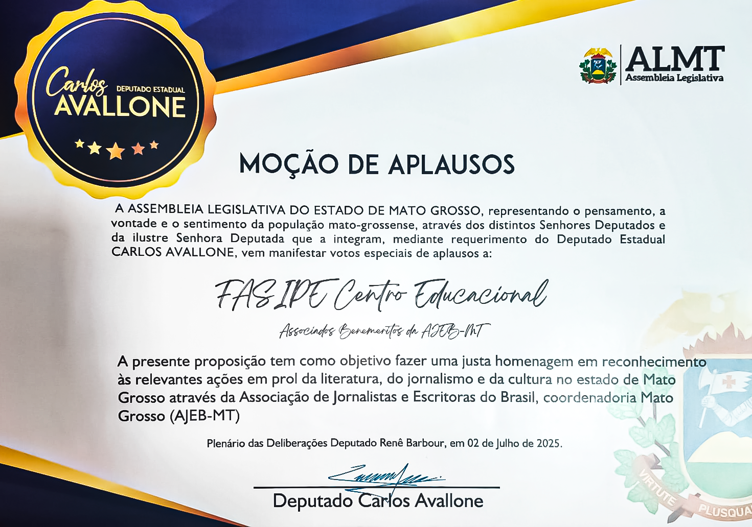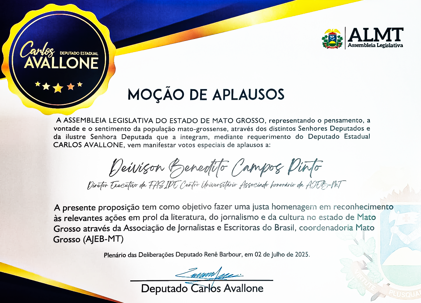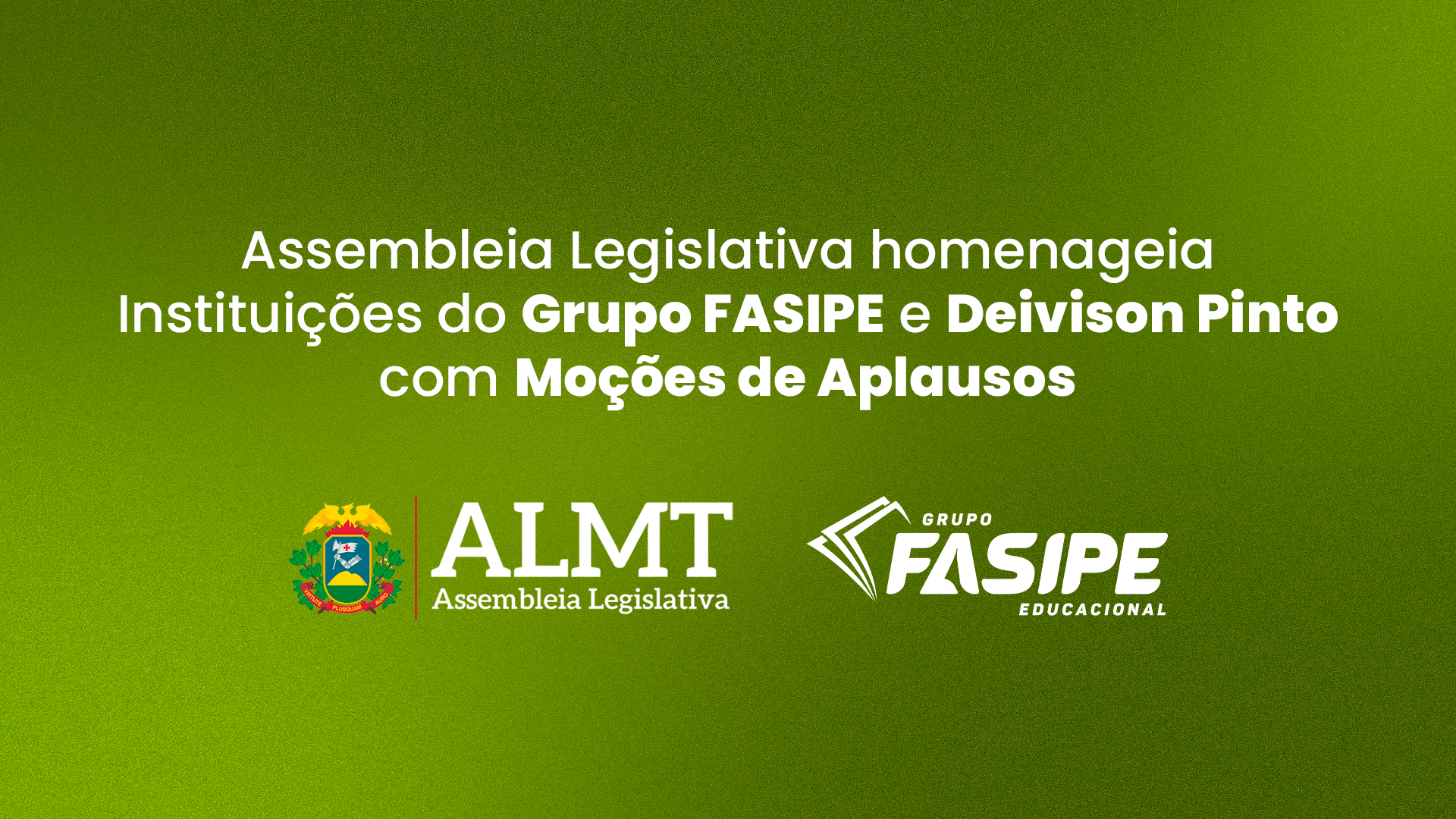 A Assembleia Legislativa do Estado de Mato Grosso concedeu, em sessão solene realizada no dia 2 de julho de 2025, Moções de Aplausos a instituições do Grupo FASIPE e ao professor Deivison Benedito Campos Pinto, diretor presidente. As homenagens foram propostas pelos deputados estaduais Carlos Avallone e Faissal Calil, e reconhecem a atuação destacada da instituição e de sua liderança na promoção da educação superior, da cultura e do jornalismo no estado.